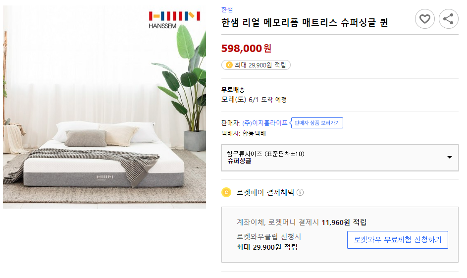 한샘 리얼 메모리폼 매트리스 슈퍼싱글 퀸